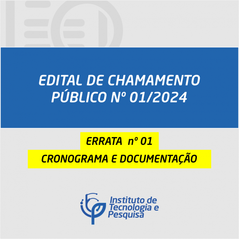 O Instituto de Tecnologia e Pesquisa – ITP torna público a Errata nº 01 do EDITAL DE CHAMAMENTO PÚBLICO Nº 01/2024, que visa Seleção de Municípios Sergipanos para Participação em Projeto do Laboratório de Gestão Pública do Instituto de Tecnologia e Pesquisa (ITP), Sergipe, em parceria com o Ministério da Ciência, Tecnologia, Inovação e Comunicações, Governo Federal, na forma que segue: